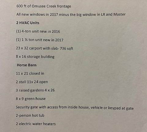 Beautiful 3/2 home on 6 +/- acres with 600 ft of creek frontage. Home features a new metal roof 2017. nice open kitchen/ DR, 2 gas fireplaces, pantry & lg laundry room w/ plenty of storage. Beautiful tongue & groove pine walls and ceilings throughout. Large LR. Upstairs welcomes you to your own private master suite that has fresh paint and new VPF. Large walk-in closet w/ storage. Enjoy a cold drink on a covered patio while watching your favorite TV show or relax in a 2-person hot tub.