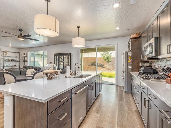 Beautiful, 2-year-old home in Southwest Meridian, with incredibly generous room sizes and abundant storage, designed not just for living but for enjoying! Better than new with included window blinds and appliances. Main level great room is anchored by a tiled gas fireplace and opens to the large dining area and chefs kitchen with gas cooktop, double ovens, quartz counters and a dream pantry. Flexible office can be a space for formal or casual usage. LVP flooring unifies the main level. The grand primary suite is a bright retreat, offering dual vanities with a prep counter, full-tiled shower, and a walk-in closet. Three additional bedrooms with oversized closets and a spacious utility room complete the second floor. Covered back patio with a gas stub for BBQ or fire pit in the north-facing backyard, perfect for year-round use. Home is serviced by a water softener and reverse osmosis treatment system. Quick access to freeway, downtown Meridian, and schools from this centrally located newer subdivision.