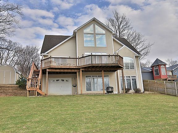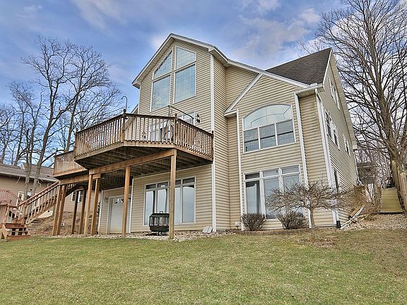 Commanding views from this spacious lake home on a beautiful bluff setting. 62' of water frontage and over 4000 sq.ft. of living space. Whether a seasonal lake house or year around living, this home can entertain all your guest. Main home offers 5 bedrooms, 4 baths with additional 2 bedroom, 1 bath attached guest house. Great floor plan with open concept living. Fully appointed kitchen with bar seating and separate dining area...all with water views, vaulted living room and open loft offers stunning views from the wall of lakeside windows. Large main level master suite with jetted tub and walk-in closet, additional main level guest bedroom with separate full bath. Upper level offers 3 additional bedrooms and shared full bath. Walkout lower level offers a spacious family room with great lake views, possible 8th bedroom (no egress), and additional full bath. 14 x 30 lakeside basement garage great for lake toys and boat storage...with small shop area. Attached guest house offers a little separation with full amenities...spacious kitchen and living room. Enjoy this peaceful setting within a stone's throw of the main lake and activities. Best of both...plenty of parking space and plenty of lakeside yard to enjoy.