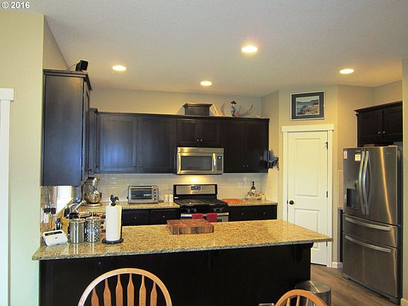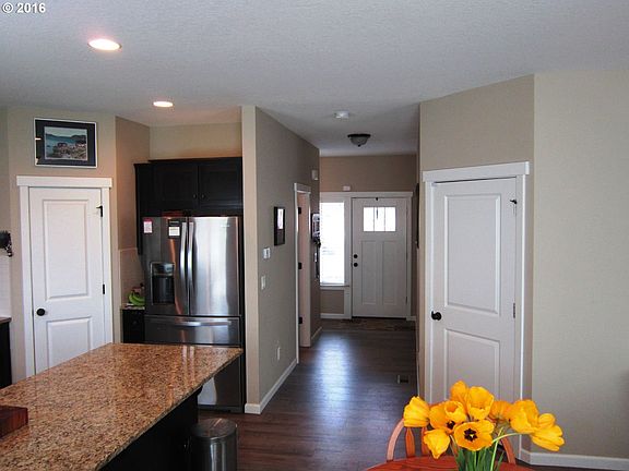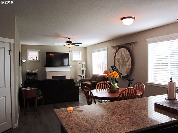 Open floor plan with 9" ceilings, gas fireplace, windows with blinds, hardwood floor main level & carpet upper. Kitchen has dark brown cabinets, stainless appliances, granite slab counter-tops, & pantry. Oversized master bedroom & adjoining bath with walk-in shower & soaker tub. Lanscaped yards, gated boat/trailer storage, fenced backyard, fire-pit, covered patio, raised garden.