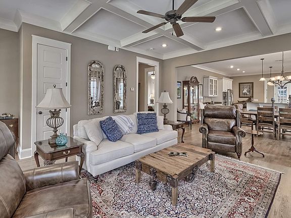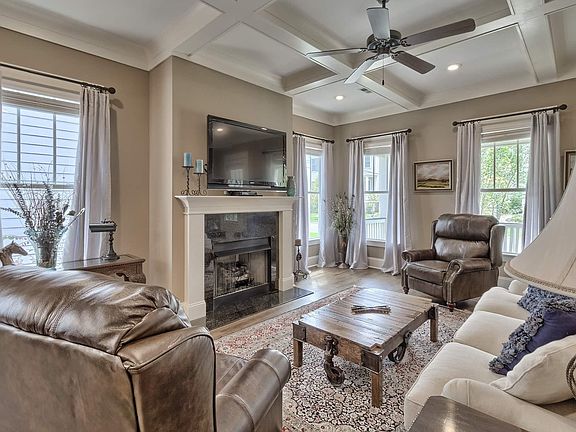 - Living Room: Fireplace, Floors-Hardwood, Molding, Ceilings-Box, Ceilings-High (over 9 Ft), Ceiling Fan, Recessed Lights