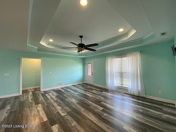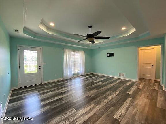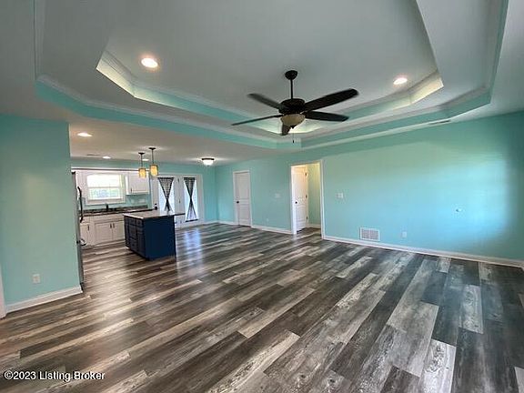Lovely three bedroom two bath brick ranch style home is waiting for you with it's desirable open concept floor plan & vinyl plank flooring throughout. Covered front porch greets you as you enter into the spacious Living Room with decorative. double tray ceiling that flows into the Kitchen that offers nice white cabinetry, stainless appliances & great center island bar. Eat in Dining area overlooks the large back yard. Separate Laundry Room is an added bonus. Vaulted Primary suite with walk in closet & Primary Bath offers double sink vanity. Two additional bedrooms & full hall Bath complete the interior of the home. Outdoor amenities include covered porch, covered patio, outbuilding & large yard. Near Bardstown & the BG Parkway makes it an excellent location. Let's Look Today!