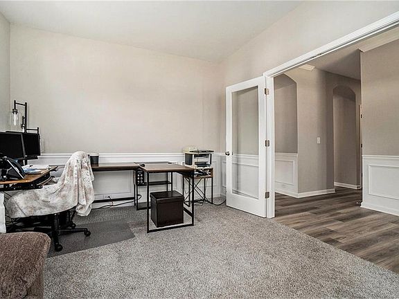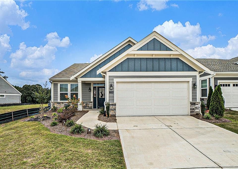 Welcome to this like-new ranch home built in 2024 in an active adult community in Dallas, Georgia, offering breathtaking countryside views that can be savored from the oversized screened-in porch—already fitted for glass insert options to easily transform into a four-season dream room—or from the open patio, perfect for grilling and cozy evenings by the firepit. The inviting one-level layout features an open concept with a twist, showcasing a stunning double-sided stone fireplace enjoyed from both the living and dining areas. The kitchen is a chef’s delight with a breakfast bar island, granite counters, stainless steel appliances, and upgraded LVP flooring throughout, complemented by custom window shades installed across the home. A large primary suite boasts a huge walk-in closet and a spa-like bath with a double vanity and a walk-in shower with glass surround. A private office with French doors provides an ideal workspace, while a secondary bedroom with a full bath adds flexibility for guests. The spacious laundry room, convenient hall access, and mudroom drop station off the garage make everyday living effortless in this charming home.