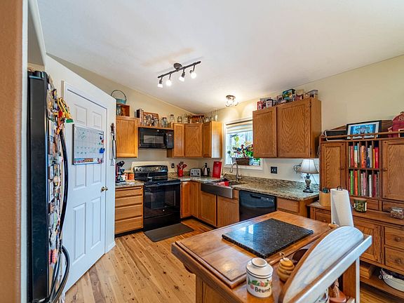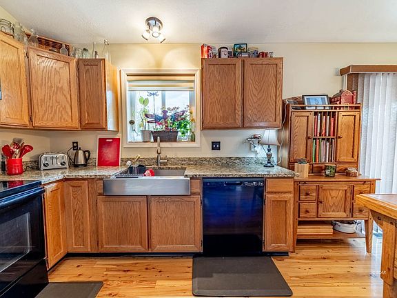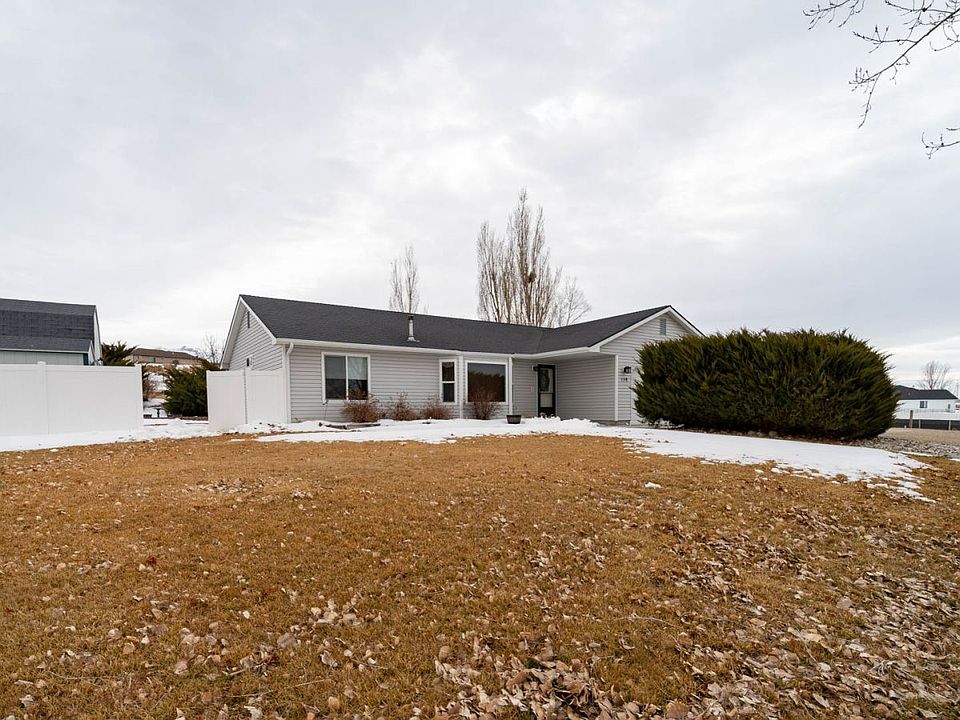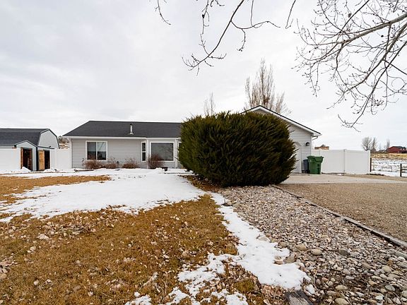 Welcome home! The home offers three bedrooms and two updated bathrooms with 1467 square feet of open living. The kitchen has a nice sized pantry all appliances to stay and a dining area that has access to back yard. There is a pellet stove with thermostat in the family room to help keep the home cozy. Split bedroom floorplan that has beautiful Australian pine flooring in the living areas, plenty of storage. Established yard with pergola over the back patio, fruit trees and well thought landscaping along with two sheds that are insulated and have heat/power. Back yard and large side area all fenced with ranch fencing. Anthem is to the house and the seller has signed up for natural gas
