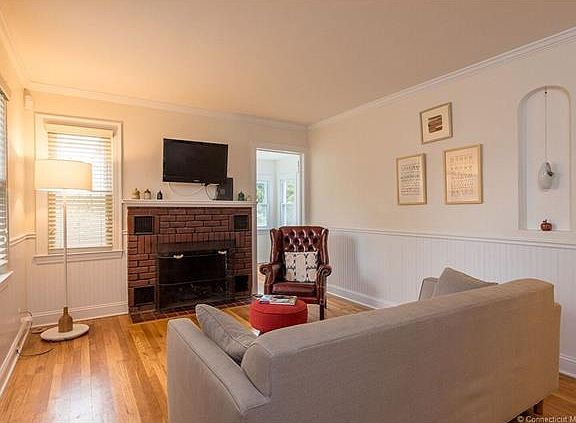 Charming Cape Cod style home completely remodeled in 2009, offering 3 bedrooms (one on first floor) and 2 full baths. Beautifully detailed with crown molding, wainscoting and hardwood flooring throughout. In addition to a bedroom, the first floor also includes a family room with wood-burning fireplace, office/sunroom, and the kitchen which opens to the dining room. Two large bedrooms and a brand new full bath on the second floor. Pretty much everything is newer: roof, siding, windows, hydro-air furnace, central A/C, plumbing, 200 amp electrical system. Please note kitchen does not have a dishwasher, but there's space for it and a hook up. Additional features include a new patio, central air, security system. Nothing else to do but move in!