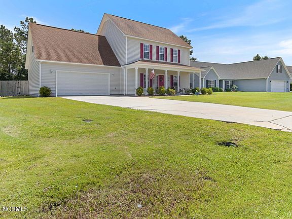 Spacious 4-bedroom, 2.5-bathroom home sits on nearly half an acre of land in the heart of Havelock. As you arrive, you'll notice the paved driveway leading to a two-car garage, framed by a covered front porch and established flower beds, offering a warm welcome. Inside, the foyer sets the tone, with the formal dining area to the left, showcasing crown and chair rail molding, and a convenient half bath to the right. The spacious living room features plush carpeting, elegant crown molding, and a cozy gas fireplace, seamlessly connecting to the kitchen. Here, you'll find stainless steel appliances, a breakfast bar, and a pantry—perfect for both everyday meals and entertaining. The large primary bedroom is a true retreat, complete with his-and-hers closets and an ensuite bathroom featuring a soaking tub and walk-in shower. Upstairs, three additional bedrooms, including a spacious room over the garage, provide plenty of space for guests. These rooms are all carpeted with reach in closets and share a full-sized bathroom. The laundry closet is thoughtfully located on the second floor for added convenience. From the primary head upstairs to the THIRD floor to find an 11x14 carpeted attic for extra storage or a potential hobby room! This home has all of the space you need! Out to the backyard, a concrete patio overlooks the expansive fenced-in backyard, ideal for outdoor gatherings. A large shed provides ample storage for all your outdoor equipment, while a small gravel yard with established garden beds offers space for gardening enthusiasts. Minutes from MCAS Cherry Point and a short drive to Crystal Coast Beaches and Historic Downtown New Bern!