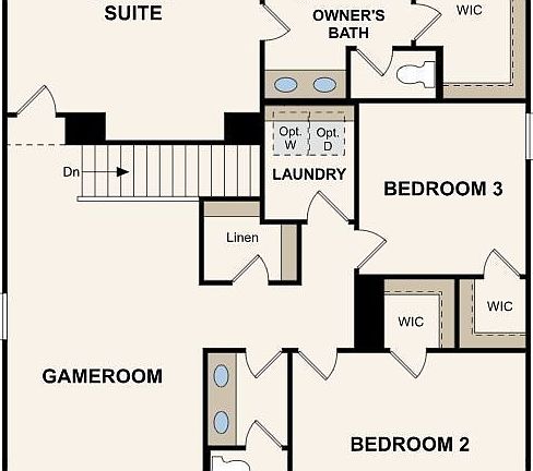 Step into the Woodruff at Barton Hills, where modern design meets everyday comfort. A full front porch sets the tone for welcoming curb appeal, inviting you inside to a thoughtfully designed layout. The open-concept main floor is perfect for gathering, with a spacious great room featuring an electric fireplace, a dining area with patio access, and a stylish kitchen with sleek dark gray cabinets and a center island for effortless entertaining. This home offers a fourth bedroom and third full bath on the main floor, providing a private retreat for guests or multigenerational living. Upstairs, a large game room creates a flexible space for movie nights, a play area, or a second lounge. Two secondary bedrooms—each with walk-in closets—deliver ample storage, while the secluded owner’s suite offers a relaxing escape with a walk-in closet and an en suite bath.