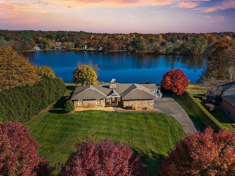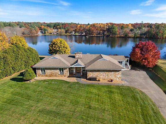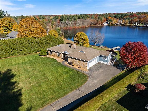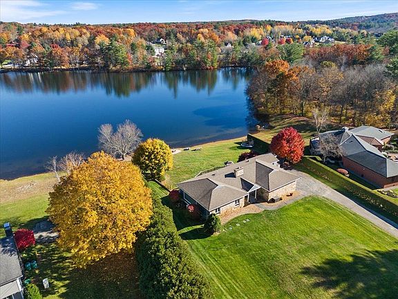 Newly available! Discover this exquisite contemporary ranch nestled on Wilson's Pond, offering picturesque views for every season. Located on a private road, enjoy the outdoors with 150 feet of waterfront, perfect for electric boating, kayaking, paddleboarding, fishing, and exquisite bird watching of blue jays, robins, eagles, and blue herons from the private 40-foot balcony. The chef-inspired gourmet kitchen is sure to impress, featuring a premium Thermador cooktop, double oven, and a generous island adorned with stunning granite countertops and custom Birch cabinetry, providing ample storage space. Almost every room offers panoramic water views, with the inviting step-down living room showcasing a striking stone fireplace. Recent upgrades enhance the home’s appeal, including a new septic system installed in 2020, renovated baths, hardwood floors, fresh paint, two Tesla batteries for improved energy efficiency, and mini-split systems for comfort in every season. With four spacious bedrooms and three beautifully designed bathrooms, there’s ample space for family and guests alike. The walkout lower level is ideal for an in-law suite or entertaining. This home is located in the sought-after North Salem School district and offers quick access to major conveniences. This property beautifully combines luxury and serenity—don’t miss out on making it your own! Showings to begin Fri from 3-5pm!