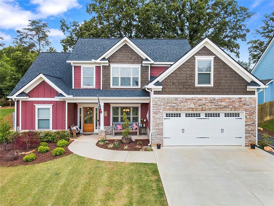 Look no further!! This beautiful ranch home with private outdoor living space on a wooded lot is perfect for you!! Enjoy the fire-pit, expansive patio, and cookout on your grill that can be hooked up to an outdoor gas line. On the main level, you will find an oversized owner's suite with spacious bathroom and walk-in closet. The eat in kitchen has many cabinets, a large pantry, and views into the family room. The open floor plan is suitable for hosting and entertaining guests. All the cabinets in the house have the soft close feature and the home has lots of storage on the upper level and attic. Secondary bedrooms upstairs are spacious and share a bathroom along with a big bonus room. Downtown Ball ground is great, with shopping, dining, brewery, winery and parks - you will want to check it out!