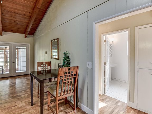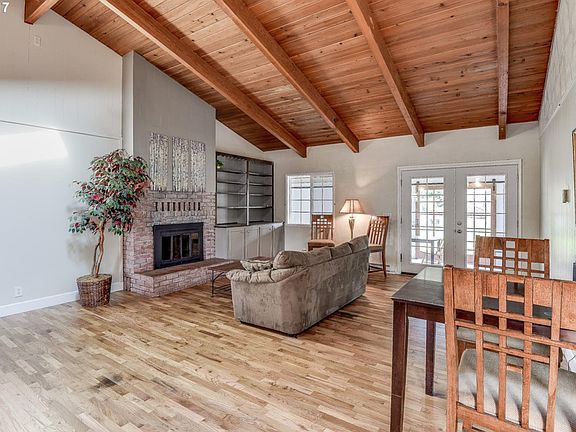 Delightfully updated ranch with open floorplan! Bright kitchen has skylight, island, SS appliances, and opens to big living room. Vaulted ceilings, milled ceilings, exposed beams, wood burning FP, eating area, and French doors to a large, enclosed patio for year round entertaining. Sliding barn doors off patio lead to huge backyard with fire pit. Updated bath, refinished hardwoods, new paint! 1-car garage, +128 SF den/office not in SF!