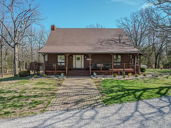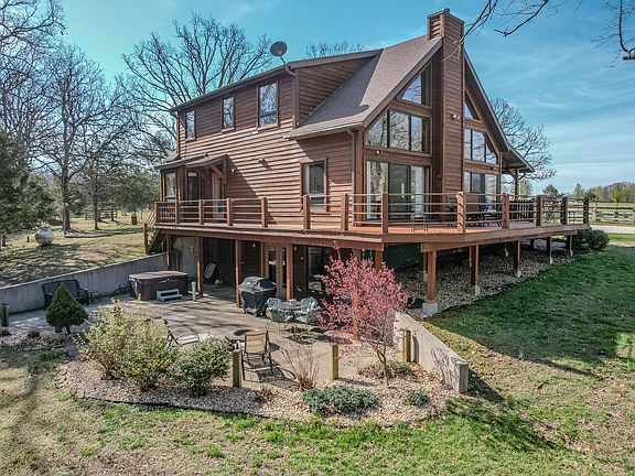 Bring your horses and ATVs to this mostly furnished luxury Amish crafted 19-acre retreat! Home is lodge-style timber framed with 23' cathedral ceilings, mortise-and-tension joinery hammerbeam with oak pegs. Stone-accented fireplace with oak mantel is surrounded by floor-to-ceiling windows allowing sunlight to flood the open-concept home. Kitchen island topped with 3 1/2'' thick live edge solid oak, new dishwasher and induction stove. Main-level master suite boasts screened-in porch perfect for sipping your morning coffee. Main floor laundry complete with washer/dryer. Stunning solid wood staircase leads to generous loft area, private bedroom and full bathroom. The lower level offers a spacious living area for spreading out and enjoying all your favorite indoor activities, another bedroom and full bathroom. Wrap-around porch hugs the exterior offering plenty of outdoor space to entertain or enjoy the serenity this slice of heaven offers. Large patio off the back of the home grants another spot to enjoy the peaceful outdoors and relax in the 4-person hot tub that stays with the property. Detached 2-car garage houses a private office. Upgrades and attention to detail continue throughout the property. 8-stall horse barn includes a private fully furnished apartment and an indoor 60 x 60 arena, tack and feed rooms. Stall area includes overhead heater, mats and insulated water bucket holders. Property includes 100 x 55 outdoor arena, 180 x 60 paddock, 2 run-in shelters, large storage shed, 6 plus acres of pasture cross fenced into 3 pastures. Retreat not only built for beauty, but also with efficiency and convenience top of mind. Whole house back-up generator, 2 new heat pumps, new furnace, SIPs closed cell insulation, bright LED exterior lighting, tankless water heater, tornado shelter, double oven, induction stove, etc. Pasture to timber is approximately 30 to 70. Apartment & office sq ft not included in listing detail. HOA private access to lake and
