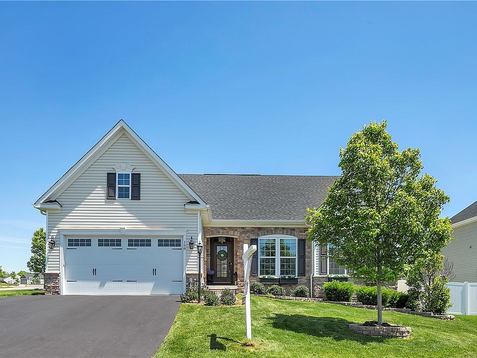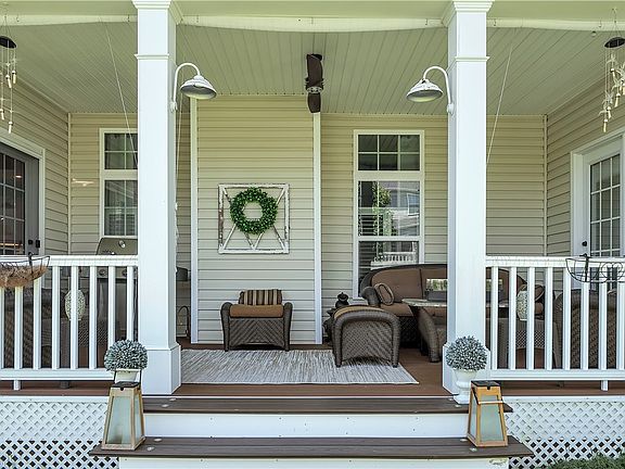 Like new Stone&sided ranch-many custom features.Lovely lot-trees,landscaping stones&lighting added.Coverd entry to 12-panel glass door w/transom.Find wideplank handscraped dark hardwd.French doors to light&bright 1st flr den w/dbl window.Mudrm from att grg w/bench,storage&closet.Great rm w/impressive coffered wood ceiling,stone fp w/reclaimed mantle flanked by fireside windows,plantation shutters,hardwd&open to gourmet Kitch.Spacious kitch boasts walkin pantry,ivory cabients w/mocha glaze,thick granite top barnwd cen island,under cabinet lighting,highend stainless.Dining rm w/french doors to covered trex deck w/natural gas grill.1st flr mastr w/treyed ceiling,new carpet,barnwd wall&crown mold.Master bth w/glass&ceram shower,dbl basin ivory granite topped vanity,custom mirrors.BR2 w/walkin&access to full bth w/espresso cabinets&high end fixtures.Fin low lev w/2nd office,BR3,Full bth.Game rm,custom repurposed bowling alley wood bar in bar room.Custom lighting,fixtures,wood accents&more.