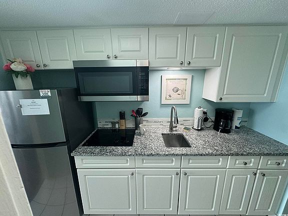 One-bedroom oceanfront condo updated in 2022 with new coastal style furnishings, cabinets, flooring, paint and decor for all the comforts of home. New king bed and mattress with extra comfy pillows. Ceiling fans and smart TVs in both the BR and LR; keyless entry lock; plenty of storage throughout. LR sofa opens to a full size bed plus there is a double murphy bed. Kitchenette with stainless refrigerator, microwave and cooktop, and granite countertop. Bathroom has tub/shower, toilet, and vanity. Great investment opportunity offering spectacular views of the Atlantic ocean! This unit is larger than the lower units and has a murphy bed. Sea Watch Resort is a gated community at the North end of Myrtle Beach. The Resort sits on 10 acres and features many amenities: 5 outdoor pools, 2 indoor pools, 12 Jacuzzis, lazy river, an oceanfront restaurant/lounge, fitness room, Tiki Bar, Starbucks café and much more.
