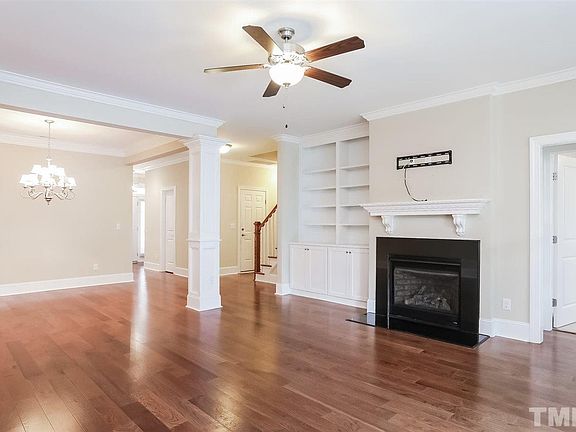 Built in 2015, this Garner two-story offers hardwood flooring, a fireplace, granite kitchen countertops, a loft, and a one-car garage.