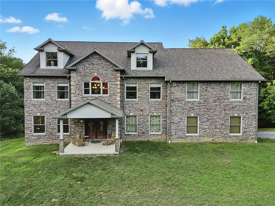 Are you looking for a forever home with room to grow? Start a new chapter here! Constructed with long-term living in mind, this stone-faced Colonial’s layout is rich with both finished luxury (4556 sqft) and future possibility. The luxury of space begins with your surroundings, over 5 acres of freedom with a thick perimeter of trees nestles this home in rare and perfect privacy. Venture inside the stately double doors to light-filled living space of grand proportions. Soaring 18 ft ceilings, stacked windows, a warm fireplace, and the soft glow of recessed lighting fills the heart of this home- an open-concept family room that flows freely into the kitchen. A massive island anchors the cabinet-rich kitchen, the perfect station to meal prep and serve with everyone gathered ‘round. A ready-to-finish attic and full walkout basement with a second living quarters already mapped out is a nod to future expansion.