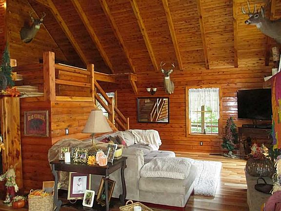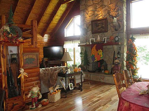 Outstanding log home in the perfect setting. Open floor plan w/ 2 story living room & stone fireplace. Kitchen w/ large breakfast bar, full bath on main, loft and master suite on second floor w/elegant bath includes soaking tub and vanity. Finished lower level w/den, full bar and family room. Covered front porch w/swing to enjoy the serene surroundings. Patio, above ground pool & outbuilding for storage w/Hardy outside wood burner. Beautiful inside and out 6+acres. Wonderful hunting area.