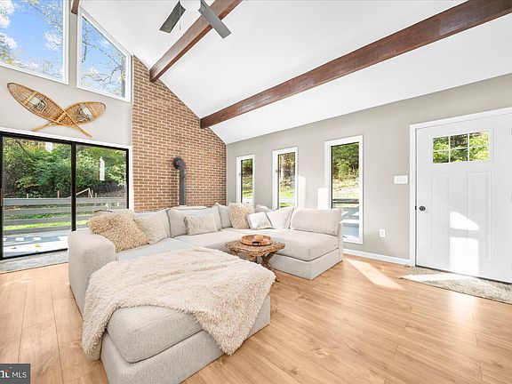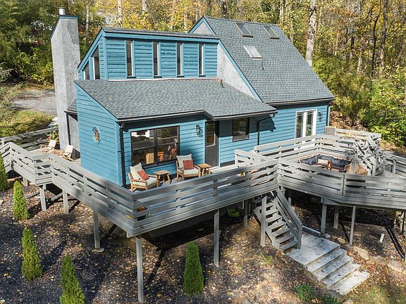 Nestled into the mountainside and surrounded by the mature landscape, this beautifully modernized contemporary home offers both privacy and sophistication. The expansive wraparound deck—spanning three-quarters of the home—creates seamless indoor-outdoor living with multiple access points from nearly every room. Inside, the open layout is filled with natural light from vaulted ceilings and skylights, enhancing the home’s bright, airy feel. The inviting living room with wood stove is open to the dining space and kitchen with Corian counters and brand new stainless steel appliances that remain. A bedroom and convenient laundry room with access to the deck complete this level. On the second floor, the private main bedroom suite features skylights, vaulted ceiling, and a full bath, a serene, elevated atmosphere perfect for relaxation. The fully finished daylight walk-out basement extends the home's living space with a cozy electric fireplace, custom wood accent wall, two additional bedrooms, and utility space. It also provides direct access to the two-car garage, blending function with thoughtful design. Access to William Penn State Forest is just up the road! With a fully fenced yard, fire pit, and peace of mind with recent upgrades such as a brand new Marathon hot water heater, well tank, and architectural shingle roof, this stunning mountain retreat can be immediately ready for its next owner—where contemporary living meets nature’s beauty.