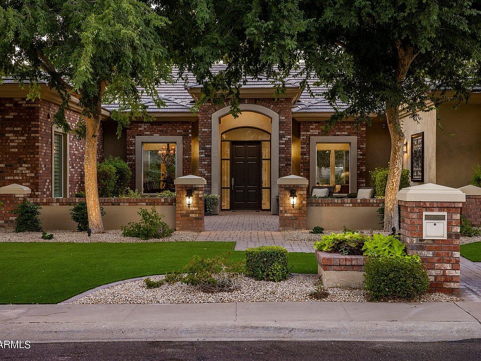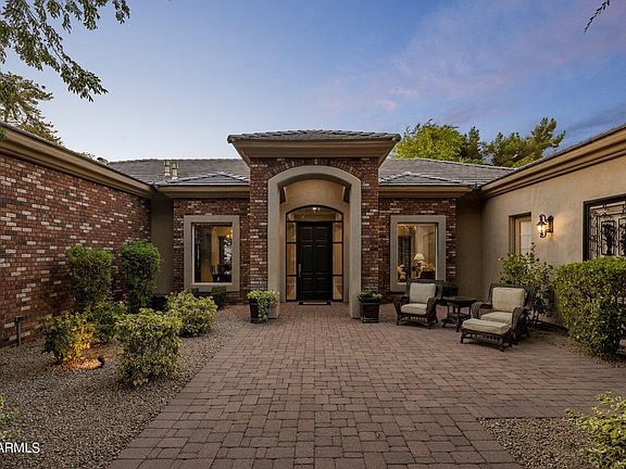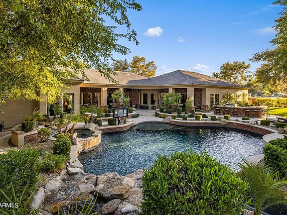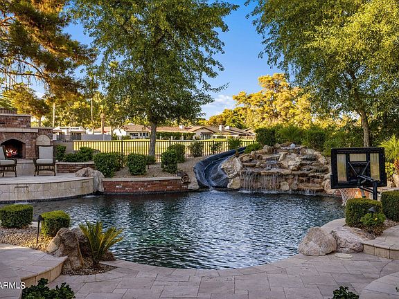 Exquisite property situated on 1/2 acre golf course lot, on the premier cul-de-sac of Moon Valley. Built in 2007 with 12' ceilings, quality finishes and attention to detail. Gourmet kitchen features top-of-the-line Wolf and Subzero appliances, wine fridge and ice maker. Enjoy 5 spacious en-suite bedrooms, plus den. Primary suite includes a spa-style bathroom, complete with a luxurious steam shower, jetted tub & walk-in closet. Bedroom 2 has private entrance from courtyard. This resort-style backyard offers everything you could imagine! Cook your favorite foods at the outdoor kitchen, warm up around the brick fireplace or roast s'mores around the firepit. The diving pool features a water slide, waterfall and heated spa. Enjoy a covered patio and a manicured play area with artificial turf.