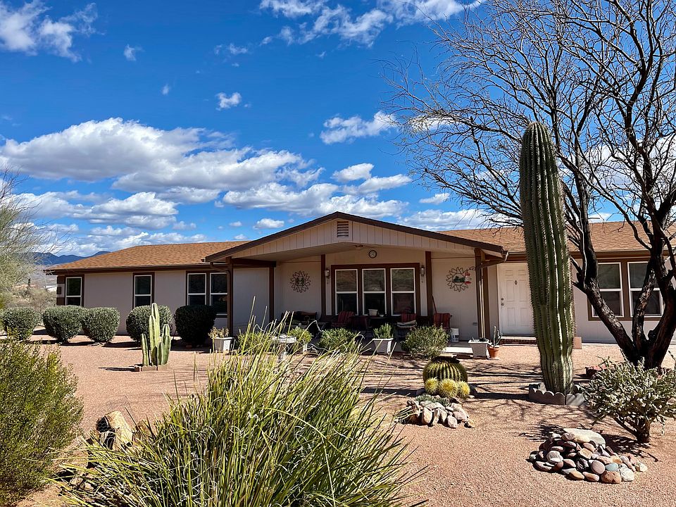 You will Love the 360 degree Panoramic Views! Custom designed 2304 sq ft Karsten Manufactured home built in 2005. Total Electric w/ Island Kitchen features smooth cooktop, Double ovens, Refrigerator, & Microwave, Breakfast bar & Custom cabinetry. Two large pantries, built in office & large utility room. Spacious living room, separate dining room, split floor plan 3 bedrooms 2 baths Lots of storage and large closets. Enjoy awesome Sunrises & AZ Sunsets from front or rear covered PatIos. All sItuated on 1.38 AC Of lush desert landscaping with water system.Large 1500 sq ft Detached Insulated Garage with 1/2 Ba path PLUS tall RV carport with full hookups. Large Native trees Border TN Forest on North & West boundaries. Ample parking & pull through circle Drive. Call for appointment to see