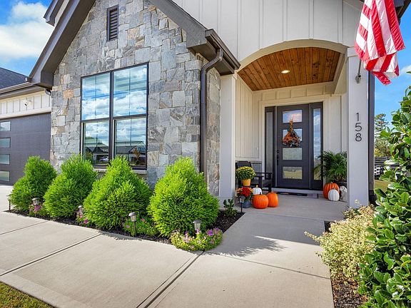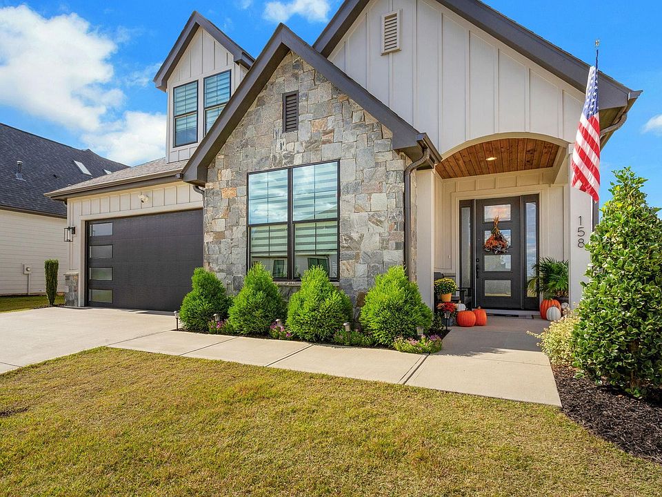 Immaculately adorned and customized! This is one of those rare opportunities that will not be on the market long. The feel of a custom design with upgraded features and a great price will make this your dream home. A beautiful foyer entrance sweeps into the large living/kitchen/dining area. Special features include upgraded pulls on all openings, lighting upgrades, GE Cafe appliances, in wall double oven with convection, quartz counter-tops, large Farmhouse sink, custom Shaker Cabinetry and a walk-in pantry. All overlooking the large entertainment/living area and fireplace. Just a few steps from the kitchen and living area are two access points to the highly customized covered patio with outdoor fireplace, beautiful ceiling deck, upgraded plank flooring, and Easy Breeze window and screen treatment including shades. This indoor/outdoor combination allows for year-round entertainment and relaxation with views of the private backyard and customized fencing. Heading into the Master Suite, Judges Paneling along the corridor welcomes you to a beautiful Master bedroom and en-suite with French Door entry. Every feature you would want in a luxurious spa en-suite are included: walk-in shower, soaking tub, frosted windowing, tile, upgraded light fixtures, framed mirroring and more. A front Office suite can also double as a guest bedroom. The second level features a bonus room/living area with sky lights and motorized shades, two spacious bedrooms, one with walk-in closet, large full bath and multiple attic access points, all with great storage opportunities and floored area. Custom layered shades provide privacy and style throughout this home. The local HOA provides handsfree yard Maintenace year-round, full inground sprinkler system, care of the common area and assumes cost of utilities included in landscape care. What could be more rewarding than owning a home loaded with beautiful features? Getting a great deal too. Priced at only $649,900 makes 158 Winding Rock Road a dream.