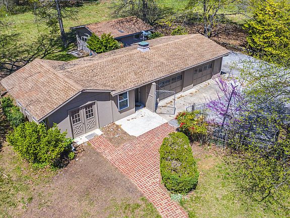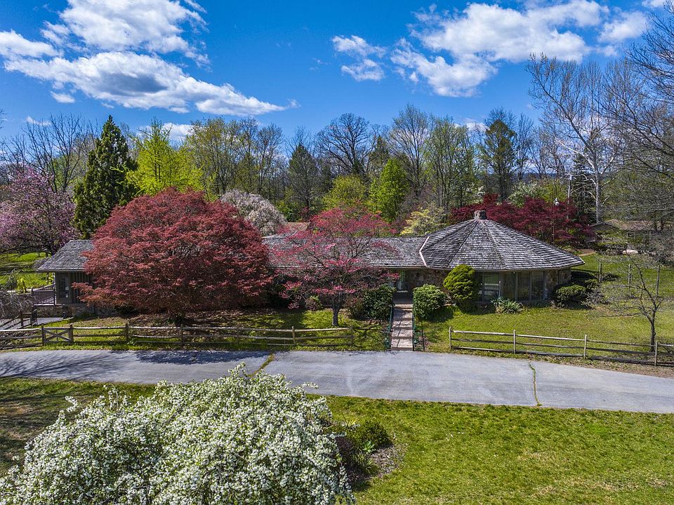 This secluded, custom-designed home with a round living area and mid-century details is like taking a step back in time to more gracious living, exquisite entertaining, and an unprecedented lifestyle. This property sits on a gated, unrestricted, 16.59 acres with 2 separate ponds (stocked with fish), mature trees, and a formal garden that begs you to sit back and relax. This rolling acreage also provides a small apple orchard and enough open area for horses. This home was originally designed and built on 16+ acres by a builder as his own home in the early 1970s and has unique architectural details everywhere! It was built for entertaining- both inside and out. Inside the front door, octagonal formal rooms welcome guests. The formal living room is the first of these rooms, with a stone central hearth on the woodburning fireplace as the centerpiece. Continue around the space to the formal dining room, which also overlooks the screened porch and has a built-in stone planter. Continue around to the well-appointed kitchen with stainless appliances, a breakfast nook, and a small study area that walks out to an expansive sunroom. The sunroom is bright and airy, with skylights, a wall of floor to ceiling windows, overlooks the backyard, and is heated and cooled by a modern mini-split heat pump. This room is truly a year-round space with double doors to the patio area covered with a wisteria-covered arbor and with a door at the other end to the large screened-in porch with bar area and stone accent wall. Back inside, all the way down the hall is the primary bedroom suite with sitting area and wood-burning fireplace, a screened porch opening to the open-air deck outside provides the perfect private sanctuary. The ensuite bath has a separate shower and a dual vanity with a dressing table, but the star of the show is the sunken jetted bathtub! A walk-in closet rounds out this amazing space. Along the hall are two additional large bedrooms with a shared hall bath. Back toward the kitchen is the main-level laundry room with cabinets and a folding counter. Downstairs, the updated vinyl plank flooring runs through the rec room, massive bonus room and attached full bath. Also downstairs is the 2-car garage entrance. The formal garden, with central sundial, is fenced from deer and has served as a specimen garden for years with a variety of mature trees and shrubs from around the world. This garden area is ideal for garden parties! A large, screened picnic pavilion with cement floor is the perfect place to relax with friends or cook up some alfresco dinner. An additional potting shed with attached two-car garage and a detached two-car garage is also within the fenced area- that is a total of 6 garage bays on the property! Don't pass up the opportunity to own this distinctive custom home situated on over 16 acres.