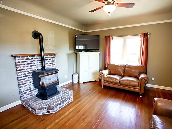 Just completed a fully permitted addition - brand new bedroom and bathroom were added. Home is heated by the gas stove - fan transports heat which is plumbed through the forced air vents. Thermostat controlled. New addition has wall cadets. Large extra deep detached 2 car garage w/ shop space. Newer roof, paint, insulation, vinyl windows, & many lovely updates! Lots of original charm, w/ hardwoods & coved ceilings. Large yard! Darling!