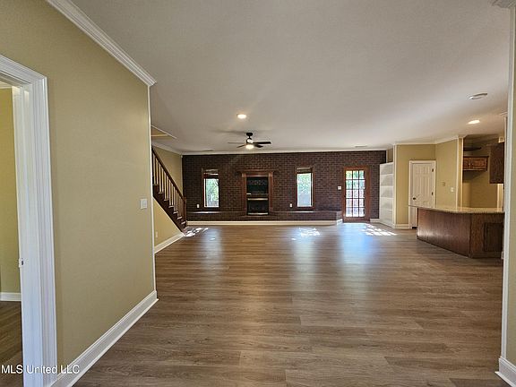 Just minutes from Hernando's charming square, shopping, dining, and the interstate—and only 20 minutes from Memphis—this one-of-a-kind 2,074 sq ft home sits on 1.17 peaceful acres surrounded by beautiful mature trees. Inside, the huge open great room steals the show with a massive brick wall with fireplace stretching across the room, while fresh paint, new flooring, updated light fixtures, and ceiling fans add a modern touch. Two spacious bedrooms are on the main level, plus an oversized upstairs room with a walk-in closet that could serve as a guest space, office, or game room. The home's thoughtful construction means you can't hear the outside from inside, offering a quiet retreat no matter the season. Enjoy a private courtyard just off the back door, and take advantage of the generous parking area behind the home. Located just minutes from the elementary, middle, and high school, this property blends convenience, comfort, and character in a setting you won't find anywhere else.