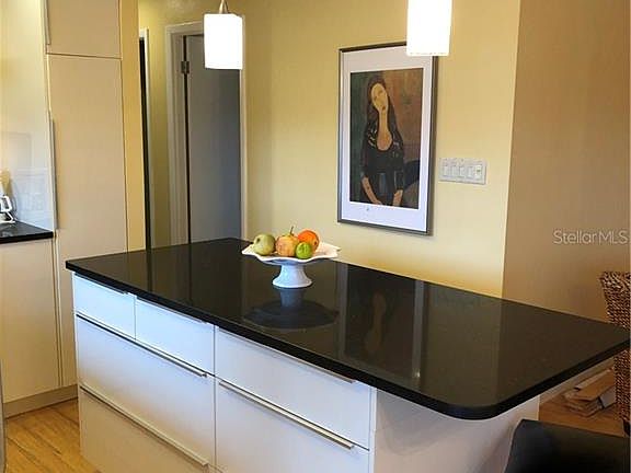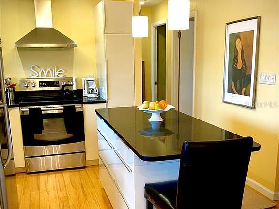 Move right in to this 3rd floor unit 2 bedroom, 1 bath condo with beautiful bamboo wood floors and a nice open spacious feeling. No popcorn ceilings, newly painted, newer AC and recessed lighting and updated fixtures. The Ikea kitchen has been completely remodeled, with high gloss cabinets and granite counters and completely open to the living and dining rooms. The kitchen has been designed with hidden storage in many places. The garbage can is in a pullout cabinet and the microwave is in the pantry with a pullout drawer. The 2 bedrooms have carpet and nice size closets with closet maid storage. There is a utility room that can be used for storage or possibly a small craft room. Low fees (210.00) / month, includes basic cable, heated pool, exterior maintenance, community center, and roof. Very well managed Association and fees have gone down in the past 5 years. Bus is close by as well as Publix, Target, and TJ MAX and lots of restaurants and shopping. The lanai area has sliding panels so that in the rainy or cooler weather you can close up the space. OVER 55 & NO PETS. HOA required background & credit check. This is a very active community with many social events throughout the year.