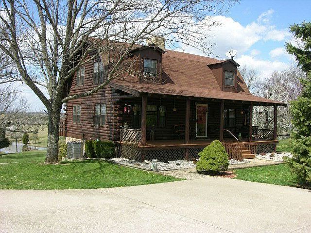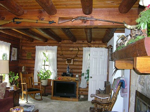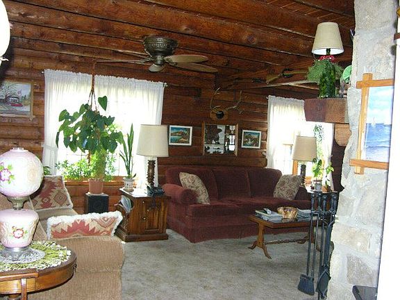 Seeing is Believing! A 5.2 Acre Paradise right outside of town complete with gorgeous log cabin and large stocked pond. 6 garages total-18x30 boathouse, 26x40 3 car detached garage with doggie condo and fenced dog pen plus 12x25 additional garage, storage shed and 1 car garage in the basement. Awesome interior design with vaulted ceilings, large kitchen w/bar overlooking dining area, 3 bedrooms upstairs and a full, unfinished walkout basement. Just look at the views from the large back deck!!