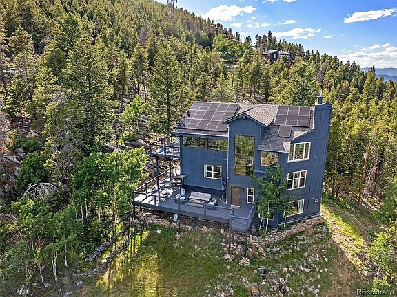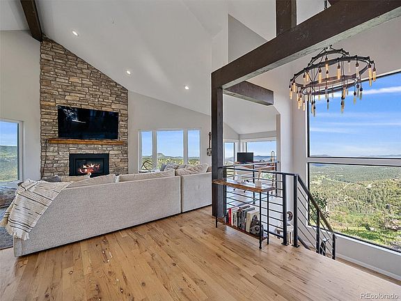 Welcome to an extraordinary property that combines breathtaking panoramic views with a mountain modern architecture. Situated on a  3-acre lot, this 4-bedroom, 3 ½-bathroom home offers some of the most stunning vistas in Evergreen. As you enter the residence, you'll be captivated by the snow-capped peaks and awe-inspiring front-range views that greet you. Step inside the great room, where beautiful hardwood floors, vaulted ceilings, and designer lighting create an ambiance of elegance. The floor-to-ceiling stone fireplace serves as a striking centerpiece, while the stunning kitchen, complete with a marble waterfall island, is a chef's delight. Expansive windows and glass doors seamlessly merge the indoor and outdoor spaces, allowing for a constant connection to the natural surroundings.  Over 1400 square feet of decks, providing ample space for outdoor entertaining and relaxation. The spacious primary suite is a private retreat, offering a sanctuary of comfort and tranquility. Pamper yourself in the spa-like adjoining bathroom, featuring a soaking tub and walk-in shower. The spacious walk-in closet provides ample storage for your wardrobe. The primary suite also conveniently adjoins another bedroom, which can be utilized as a private office or additional living space.  The lower level of the home offers two more well-appointed bedrooms and two full bathrooms, providing ample space for family and guests. The versatility of this floorplan allows for comfortable living and privacy for everyone.  Situated just minutes from I-70, commuting to Denver or the mountains is a breeze. Evergreen, with its amenities and conveniences, is only a short 10-minute drive away. Outdoor enthusiasts will delight in being walking distance to Clear Creek Open Space trail access and a quick drive to Floyd Hill biking trail. Come experience the blend of natural beauty, modern luxury, and unparalleled views. Your mountain retreat awaits!