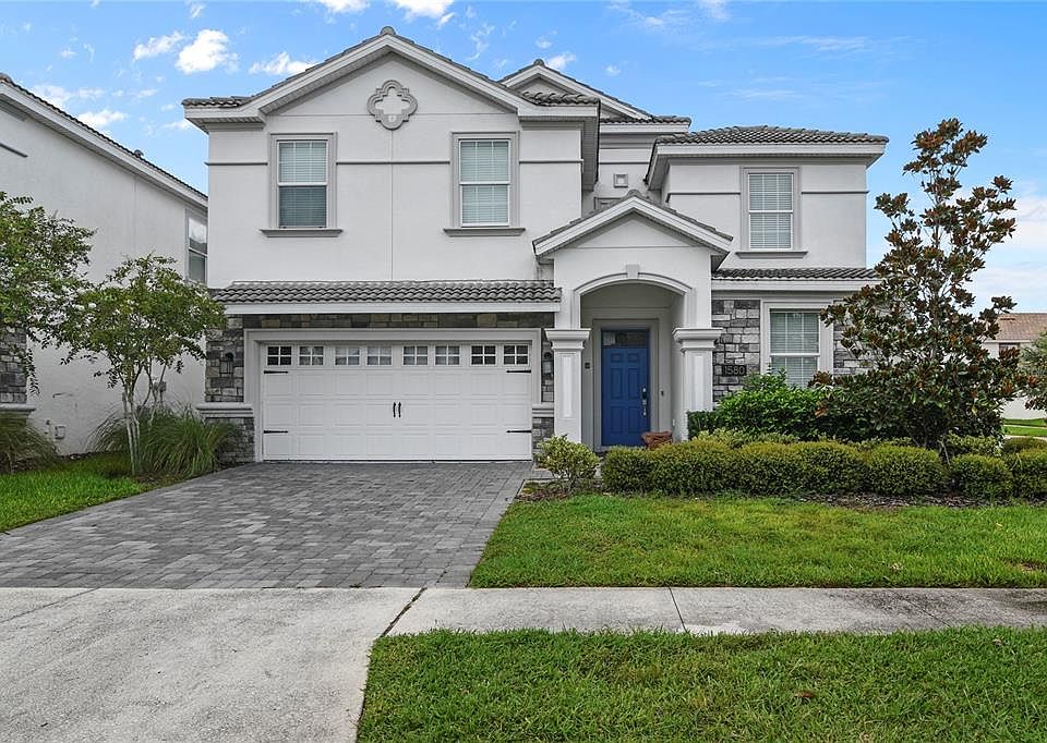 Enjoy this fully furnished 8-bedroom/5-full-bath, nestled in one of the most sought-after gated resort communities in the Orlando area, The Retreat at Champions Gate. This home stands out for its incredibly creative themed bedrooms and professionally designed spaces. Located at the Retreat neighborhood near the Oasis clubhouse, this is the perfect home for homeowners who want to enjoy the Florida lifestyle and for those who seek excellent returns through short-term rental. This home is filled with natural light, offers a primary bedroom on the main level with bathroom that has access to the pool deck. The primary offers stand-up shower with enclosure, separate bathtub and dual vanity. There is a second bedroom with en-suite bathroom on the main level. The kitchen is equipped with granite countertops, bar sitting area, stainless steel appliances such as refrigerator with water dispenser and ice maker, microwave, range and dishwasher. The kitchen is open to the great room with family room and dining room that flows into the oversized lanai and the screen enclosed pool deck. Upstairs, there is a loft with a TV room surrounded by the six bedrooms and the bonus room, that has been converted into a theater room. The garage has been converted into a game room featuring air conditioning.