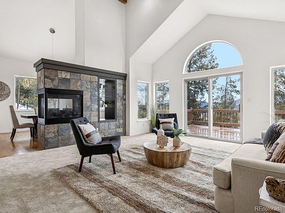 Discover your Rocky Mountain Sanctuary in this stunning 3 bed, 3 bath, mountain contemporary home nestled in the pines in beautiful Evergreen, Colorado.  Upon entrance, you are greeted with a dramatic wall of windows that frame panoramic mountain and snowcap views welcoming the spirit of the outdoors, indoors, transforming the vaulted ceiling Great room into a calming & serene space.  A striking double-sided tile surround gas fireplace will warm you on chilly winter nights. The main level boasts a light-filled formal living and dining room adjacent to a chef's kitchen beautifully appointed with hardwood flooring, a granite island with a gas cooktop, stainless steel appliances, abundant wood cabinetry, a pantry, and a breakfast nook that opens to a deck perfect to enjoy your morning cup of joe while watching neighboring wildlife pass through the 2 acres the home sits on. In just a few months a glorious wildflower garden will emerge with trickling sounds of the nearby water feature.  Entertaining friends & family is a breeze here as guests can access a 2nd deck off the living room and experience glorious sunsets. At night, adjourn to the luxurious main floor primary suite with a spacious en suite 5-piece bath and nice walk-in closet with custom shelving. The finished walk-out basement features a fabulous family room with a natural wood-burning fireplace & sliding glass doors accessing an additional patio area. Two nice-size secondary bedrooms, a full-size bath, and a laundry room complete the space.  The attached oversized 2-car garage has plenty of space for outdoor toys, This home has been meticulously maintained. Recent updates include new interior paint, refurbished hardwood floors, new carpet, new on-trend lighting, & more than $6000 in fire mitigation. Included in the sale is a Generac Generator & Invisible Fence with 2 collars. Enjoy a quick Denver commute, easy access to shopping & amenities & 45 minutes to world class skiing.