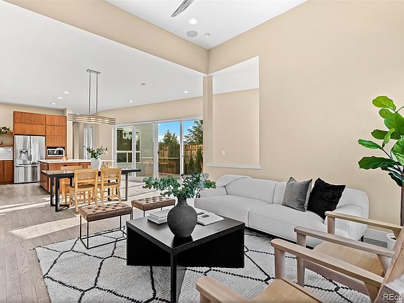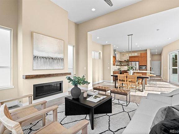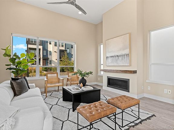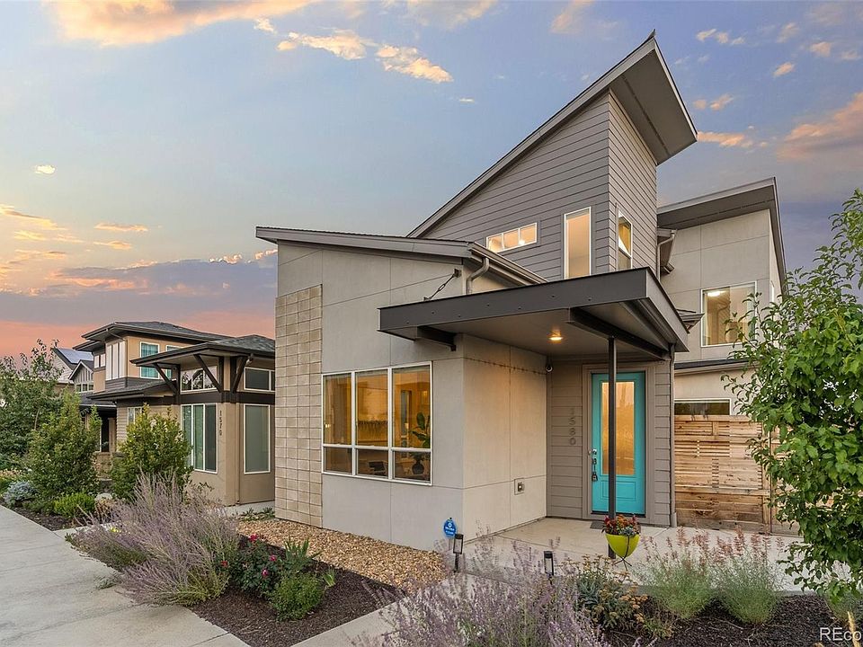 MODERN IN MIDTOWN The inviting, modern design of this popular Brookfield Signature 4 floorplan is a blend of neutral wood tones mixed with elegant finishes, dramatic diagonals, and steel beam construction. Step into a bright entryway to be welcomed with vaulted ceilings and a cozy fireplace. This open concept floor plan begs to host holidays and is built for entertaining! The kitchen is appointed with luxury detailing throughout, including Bosch appliances, large quartz island, custom tile backsplash and showcase shelving. Past the island, a wall of double sliding glass doors bring the outdoors in flooding the space with mountain views and western sunlight. Work from home in the dedicated office located on the main level and overlooking the back patio. A drop station, bench and pantry with custom built in shelving, cabinets, and baskets ensure instant organization. The large primary retreat is the ideal space for relaxation. The day fades away in the spacious bedroom and ensuite bath. Indulge in the spa shower with massaging stone floor, dual rain shower heads, and seamless shower glass door. The double vanity, quartz surfaces, walk in closet and mountain views complete this sanctuary space. There are two additional bedrooms on the upper level adjoined by a jack and jill bath providing a practical, yet stylish floor plan. The convenient upstairs laundry room includes washer, dryer, and built in shelving for organization. Fully finished basement is a blank canvas for the new homeowner. Playroom, home gym, or theater are a few options that make the shortlist of possibilities. The Trailside Academy (K-8), Montessori pre-school, clubhouse, garden, plus multiple dog parks, and playgrounds round out this wonderful community. Nearby is light rail, bus, and award-winning craft brewery with nightly rotation of food trucks. Owned 32 Solar Panels 9000 Watt System, Fiber Optic Gigabit Internet Connection, Whole House hospital-grade MIRV-16 filtration system are included.