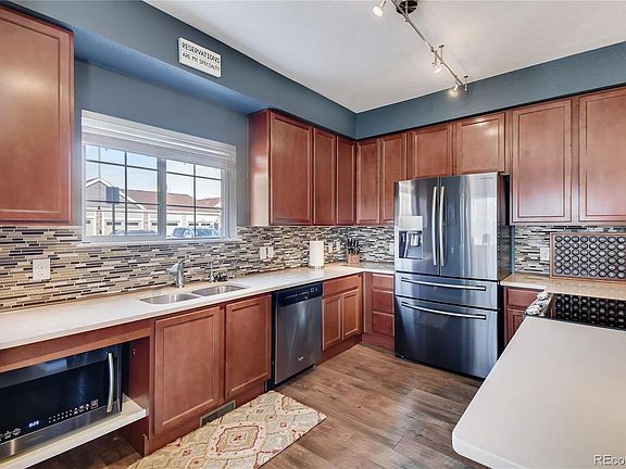 GORGEOUS NEWER RANCH Floorplan Condo in wonderful community!! The minute you walk in you will fall in love with the open floor plan which is perfect for entertaining! Beautiful kitchen with quartz counter tops, glass tile back splash, top of the line black stainless steel appliances, custom cabinets and large dining room with stone fireplace! Cozy living room. Wood floors through out. Spacious master bedroom with walk in closet and custom barn door. 2 full bathrooms with quartz vanities and custom tile. FULL unfinished BASEMENT waiting for your finishing touches!! Main floor laundry room! 1 car garage!! New Honeywell TrueCLEAN whole home air cleaning system which includes an electrode steam humidifier & IAQ thermostat. Water softener. Custom paint. Too many upgrades to list! Close to schools, golf course, parks, trails, E-470, DIA and only a 25 minute drive to Downtown Denver!! MUST SEE this beauty before its gone!!