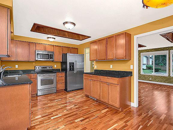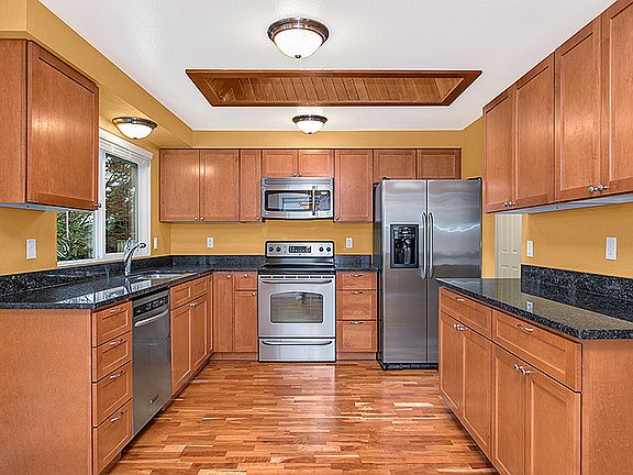 Nicely updated home with Cascade views in desirable Fairwood! Light and bright with skylights, vaulted ceilings, hardwood floors, and two fireplaces. The kitchen boasts stainless steel appliances and granite counter tops-all appliances stay, deck-perfect for entertaining and BBQ. Large family room on lower level with second entertainment sized deck. Fully fenced back yard, mature landscaping including fruit trees and plenty of space for play. Enjoy territorial and mountain views. New roof!