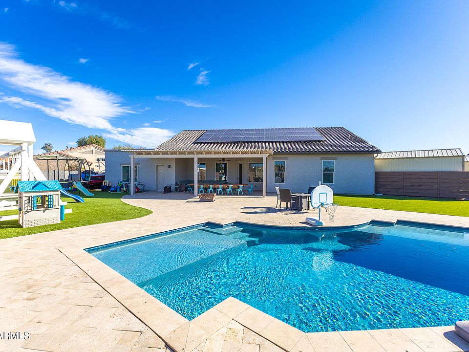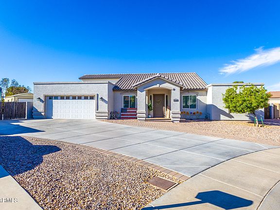 Beautiful custom built home sits on an expansive cul de sac lot. 4 bedrooms, 3 full baths, with split master bedroom floor plan to ensure privacy for everyone. Spacious master bedroom allows access to backyard. Master bath features relaxing soaking tub, separate shower, large vanity and walk in closet. 4th bedroom boasts an en suite and also has access to backyard. Gorgeous kitchen includes a gas stove/oven, walk in pantry, shaker cabinets and quartz counters. Walk through to the formal dining off the kitchen and enjoy dinners with the whole family. Stepping out back into your oasis you will see the sparkling pebble tec play pool, 2,200 sq ft of travertine deck surrounding it, large patio that features an aluminum lattice cover for extra shade, two turf areas make for plenty of space for a play set, trampoline or morning yoga. Paid in full Solar panels allows for lower electric bills for the hot summer ahead. 2 RV gates on each side of the home provides entry to side and backyard for all your toys and No HOA . The attached garage is 2.5 car, 25 ft W x 24 ft L with an exit door to side/backyard. The Concrete drive extends to the side yard where you will find 2 Weather King sheds, one measuring 16 x 12 and the other 20 x 12 with a roll up door. Come say yes to this beautiful home today!
