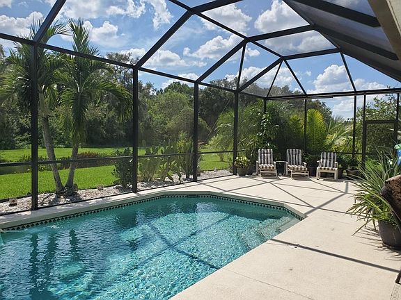 From the moment you enter this expansive 3-bedroom, 3-bath luxury home, you'll be taken aback by the serene setting just beyond the inground pool. Pass through the double glass French doors and into a living space that flows easily from an elegant dining room into a spacious great room. Triple sliding doors open the entire family room to a screened lanai featuring a pool, hot tub, outdoor shower, bar with refrigerator, privacy screens, and a breathtaking view of the lovely pond and woods beyond. The gourmet kitchen is bright and cheery and features top-of-the-line appliances, a wine rack, wine refrigerator, and walk-in pantry. Enjoy breakfast with spectacular nature views outside the aquarium windows. The split floor plan features a spacious master bedroom with dual walk-in closets and an attached bath with a stand-up shower, soaking tub, and dual sinks. Just around the corner from the 3-car garage is a beautifully landscaped yard with a private seating area perfect for watching the evening sunset. An oversized paver driveway and conveniences such as a Ring doorbell make living in this beautiful home stress-free.