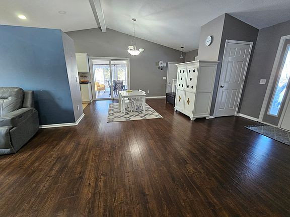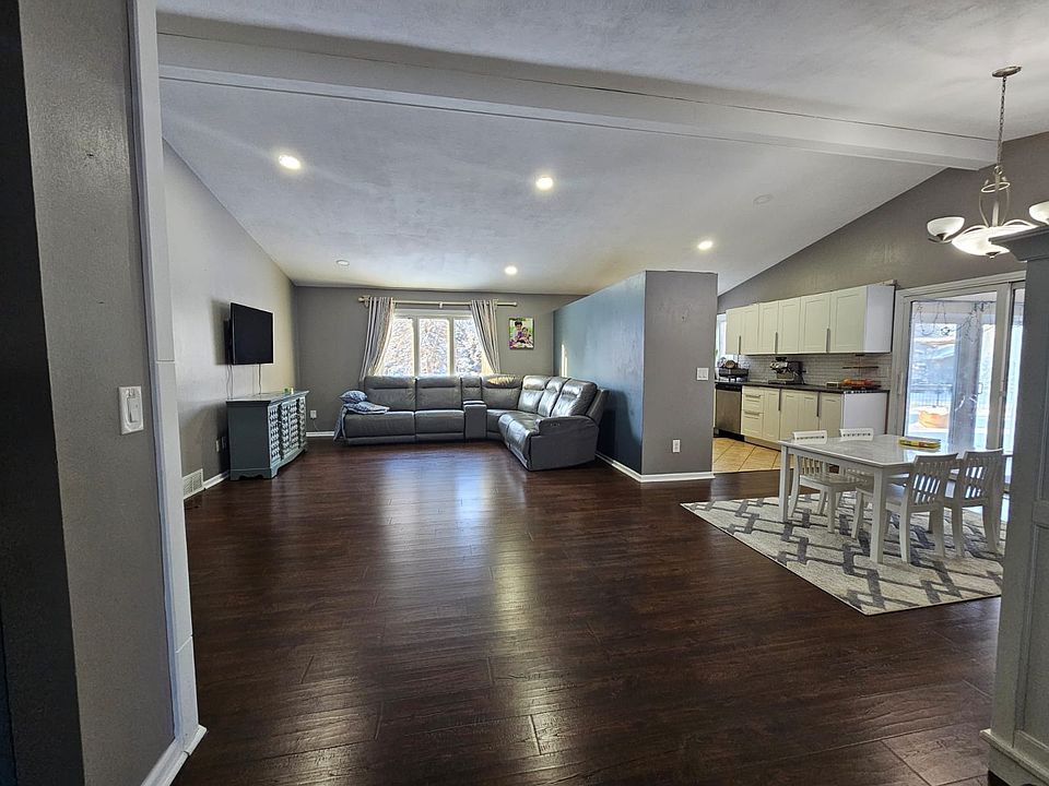 The main living area features vaulted ceilings, recessed lighting, and rich hardwood floors. The open layout flows seamlessly into the dining area and updated kitchen with clean white cabinetry and ample counter space.