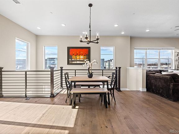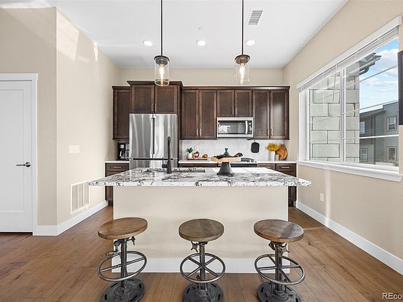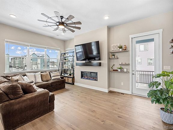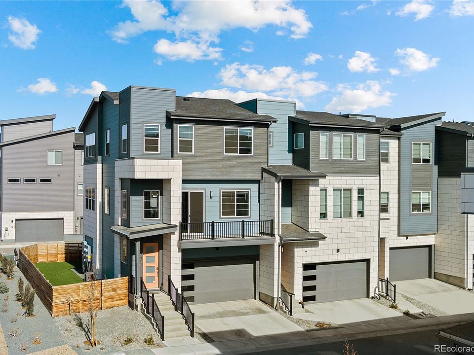Perfectly positioned on a large corner lot, this better than new Brookfield Cadence 9 is your high style, low maintenance, urban oasis. But it’s not just any corner lot, it’s THE BEST LOT for any of the Brookfield Cadence series townhome in the neighborhood, with unobstructed views to the South and West and three of Colorado’s prized fourteener’s (Pike’s Peak, Mount Evans, and Long’s Peak) on the horizon. Step inside to luxury hardwood flooring, quartz surfaces, and handsome black matte fixtures spanning all three floors! Smart home features such as the Ring doorbell, tankless water heater, high-speed wiring, and outlet equipped for EV charging in the garage set this home apart. On the ground floor, a spacious bedroom with an en suite bath serves as its own secluded getaway and affords a variety of living needs. An exterior door leads to the backyard xeriscape with laid back, fido-friendly turf. The main/second floor is an open concept with a sunny southwestern disposition. A spacious deck flanks each side of the home, perfect for indoor-outdoor entertainment. The kitchen is appointed with stainless steel appliances, custom quartz backsplash and large island, while the living room centers around a cozy electric fireplace. Three perfectly sized, light-filled bedrooms, including a generously sized primary suite, round out the third floor. Relax and unwind in the spa-like en suite primary bathroom, complete with super shower, double quartz vanity, and walk-in closet. Midtown is a community conceived as a place where you’ll want to spend time outside. From the neighborhood microbrewery, to the myriad of parks and trails, community garden, and active social calendar, this friendly close-knit hub is just 12 minutes from Downtown Denver with easy access to DIA and Boulder.