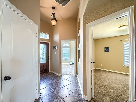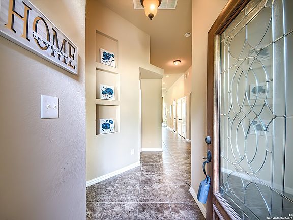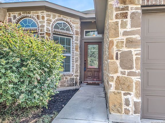 INCREDIBLE NORTHEAST SINGLE STORY WITH SOARING CEILINGS AND ON A GREENBELT, STILL UNDER BUILDER WARRANTY, SHOWING LIKE A MODEL HOME! Don't let this fantastic Castlerock home pass you by!! Gracious, gorgeous, modern and convenient, this three bedroom home with office and gas cooking will leave you wanting for nothing. Just off 1604 and only a mile from I-35, this doll is tucked in a quiet Selma neighborhood. Pull up and the rock and brick elevation, surrounded by thoughtful landscaping, exudes class, welcoming you into a foyer with elegant art niches which ushers you into an open floor plan with 11-foot ceilings. The bright office to the left offers a view of the front yard through bay window and is secluded for privacy from the rest of the home. In the hallway find access to the two car, attached garage with room for storage, work table as well as vehicles. Back inside, find the two roomy secondary bedrooms with well appointed guest bathroom accessible from the hallway. The generous solid countertop vanity leaves no one fighting for space and burnished bronze fixtures lend an upscale air. The tile surround in the tub/shower combo is the epitome of form and function. A generous laundry closet makes great use of space and plenty of room for washer/dryer and more. At the end of the hallway gasp in delight as the home opens up far and wide under those 11 foot ceilings, kitchen to living and dining with a sweeping view of the backyard and private greenbelt. WOW! The kitchen, with 42 inch espresso cabinets and granite countertops, is both beautiful and functional. Add to this delight a gas range, sure to please chefs and an island bar which offers extra dining space beyond the dining area. Wash dishes over the sink with a window (so often requested!) and have a nook for a coffee bar. The living room generously spreads to the banks of windows that bring the outside in, offering a centerpiece gas fireplace for atmosphere, and is a shape to accommodate a sectional couch, easy chairs with an ideal wall for that 85-inch TV! The primary bedroom suite is set privately at the back of the home with more soaring ceiling, view of greenbelt woods, huge walk-in closet and ensuite bath. This bath is a dream with double vanity, garden tub and separate walk-in, tiled shower with a resort feel. Outside find a north-facing (avoid that west setting sun), covered porch that wraps around from side to back of the home with a view of nothing but lawn and trees with no back neighbor. The grassy yard is waiting for your imagination -- with room for playscape, swimming pool, garden and more. All this is the coveted northeast city of Selma, literally minutes from shopping and restaurants at the Forum center, easy commutes to Loop 1604 and I-35 making access to RAFB and even downtown a breeze!
