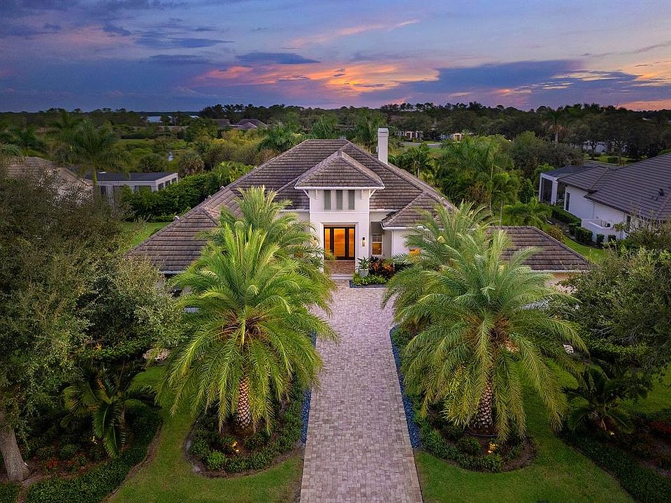 Under contract-accepting backup offers. Located in the prestigious Lake Club of Lakewood Ranch, this 2020-built West Indies–style estate offers 3 beds and 3 baths on 0.42-acre lot. A paver driveway, stone-lined landscaping, and coach lights frame the exterior, while impact-rated windows and doors, a Kohler whole-house generator, surge-protected electric panels, a 3-zone HVAC system, and a tankless water heater provide peace of mind. The home offers three garage spaces, an attached two-car garage, and a separate one-car bay, each fitted with paneled doors. The entry sets the tone with a custom rain-glass front door, a transom window, and a feature wall of framed wallpaper panels. Inside, crown molding, engineered hardwood floors in the living areas, and a seamless flow between rooms. The great room features a tray ceiling, a tiled gas fireplace with custom shelving, surround sound, and a zero-corner wall of sliding glass doors that open fully to the lanai. The office, accented with iron and glass walls and a barn door, is finished with designer wallpaper and a picture window. The kitchen is anchored by an oversized island with a porcelain countertop, pendant lighting, and a custom-trimmed base, complemented by dark perimeter cabinetry with a waterfall-edge quartz counter, glass-faced uppers, upgraded gold hardware, and pull-out shelving throughout. GE Monogram stainless-steel appliances include a six-burner gas stove, oven, microwave, vent hood, refrigerator, and dishwasher. A dry bar with a wine cooler, a reverse osmosis system supplying both the sink and freezer ice maker, and a walk-in pantry with a coffee bar add convenience. The primary suite is a retreat with a beamed shiplap tray ceiling, wallpaper accents, and pocketing sliders to the lanai. Dual custom closets are heavily upgraded and include custom lighted cabinetry, auto-motion lighting, thoughtfully organized built-ins, and plug-ins inside drawers. The spa-like bath features dual vanities, porcelain and ceramic finishes, an oversized glass shower, and a Toto washlet in a private water closet. Two guest suites each include walk-in closets with auto-on lighting and stylish en-suite baths, one with wallpaper, a trimmed mirror, and a glass shower, the other with access to the shared pool bath accented by custom tile, decorative finishes, and linen storage. A bonus room with surround sound, designer wallpaper, and expansive windows adds versatility. The lanai offers southern exposure and preserve views, with a heated saltwater pool and spa finished in iridescent tile. Custom Pecky Pine ceilings, surround sound, and panoramic screens frame the space. The outdoor kitchen features a waterfall-edge quartz counter, Alfresco grill, vent hood, tiled cabinetry, and blue backsplash, paired with Silver River Travertine flooring and generous seating areas for gatherings. The tiled laundry room includes cabinetry, folding space, and a GE washer and dryer, while the mudroom landing near the garage adds shiplap and two storage closets. The two-car garage is complete with built-in cabinets, a workspace, utility racks, and an EV charger. Residents of The Lake Club enjoy resort-style amenities, including pools, a renovated clubhouse with dining and bar, fitness center, spa, tennis, pickleball, playground, dog park, and the services of a concierge and activities director. The community is also minutes from UTC, LWR Main Street, Waterside Place, and world-famous beaches. Furniture is available in a separate package.