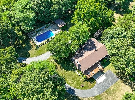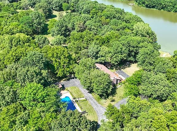 This property is a dream come true for beautiful lake living so close to the city! The home is tucked away in nearly 10 acres of secluded, lush woods on the edge of Pleasant Hill Lake. You'll enjoy the quiet and views like no other while still just a few miles from important amenities. The 3 bedroom/3 bath brick house includes a large deck with lake views, an in-ground pool with covered patio area, as well as a huge 40x60 shop. Gorgeous gardens and landscaping add to the allure of spending all your time outdoors. But indoors you will find plenty of space to relax in the wide-open kitchen/dining/living area with hardwood floors and featuring an enormous stone fireplace. The main floor primary bedroom includes tons of closet space and a luxurious bathroom with walk-in shower. With an abundance of storage, this property has everything you need to truly enjoy the best of both worlds!