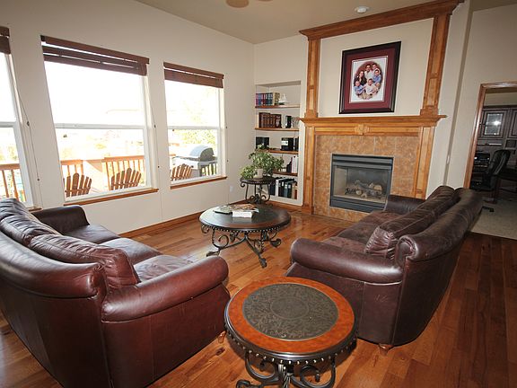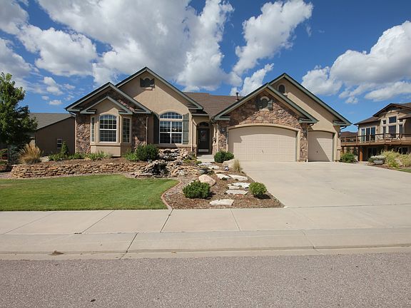 Spectacular views of Pikes Peak, Front Range & the Air Force Academy! Beautiful semi-custom ranch home in the upscale Settler's Ridge neighborhood of Jackson Creek? Popular Stratford model features hickory hardwood floors, granite, upgrades-stainless appliances, GE Advantium oven/microwave & wine fridge, formal dining, double-sided fireplace, five oversized bedrooms, office on main, 10 ft main ceilings, 9 ft ceilings in the walk-out basement, 3 car extended garage & home theater! Gorgeous professional landscaping!