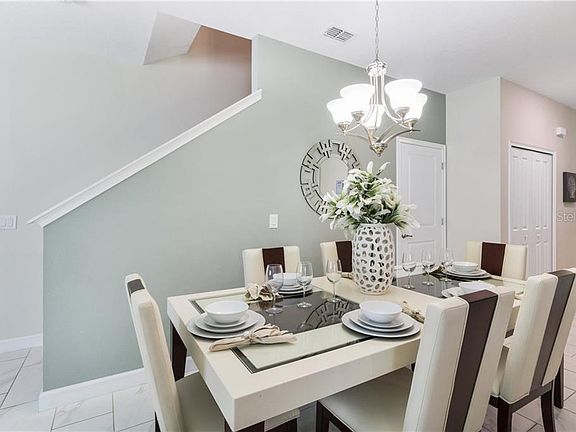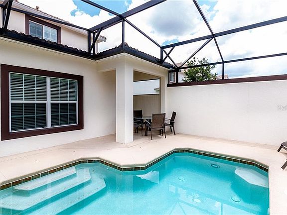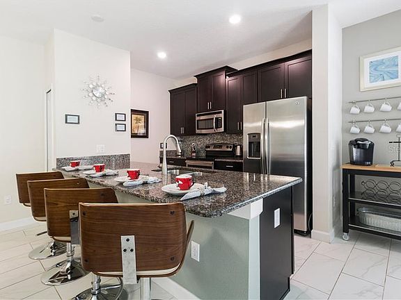 Create magical memories at this 5/4 ChampionsGate vacation dream home! This well-manicured corner townhome is meticulously decorated to appease even the pickiest of travelers. Walk down the entryway into your open entertaining area with kitchen, dining, and family room. Formal dining table has seating for 6 and is near more casual seating at the bar. Rich, dark cabinets with crown molding and stainless steel appliances adorn the kitchen with a wine bar to the right, conveniently near the outdoor entrance. Sunbathe on your screened in patio with splash pool. Did I mention no rear neighbors?! The living/family room features a large sectional and flat screen TV completing this perfect entertaining space. Also downstairs is two bedrooms (one with two twin beds and the other with one full and one twin bed), a full bath, and laundry room. Upstairs you'll find two master bedrooms and an additional bedroom (twins) and hall bath. All furnishings and appliances included!