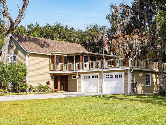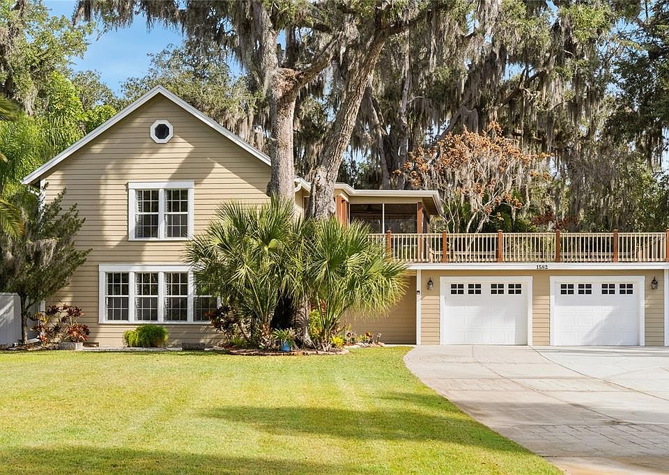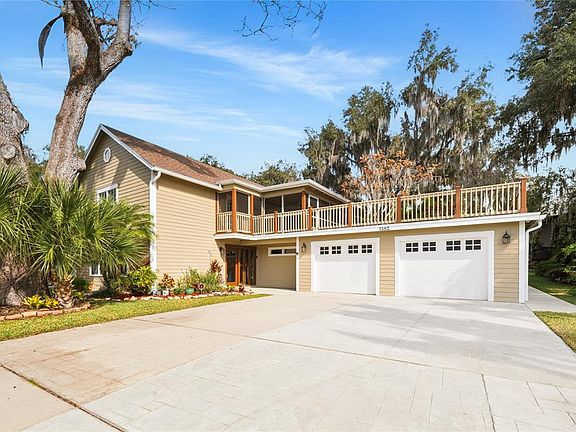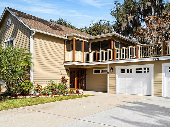 One or more photo(s) has been virtually staged. As you travel down the tree-lined streets beneath a canopy of majestic oak trees, you arrive at one of Enterprise, Florida’s most exclusive and distinctive communities—Stone Island. Known for its individuality and Old Florida charm, this remarkable enclave features custom-style homes where no two residences are alike. Upon arrival, you are immediately captivated by the character of this home, beautifully framed by mature, towering trees. French glass doors welcome you into the casual living room, where travertine flooring and plantation shutters bathe the space in natural sunlight, creating a warm and inviting atmosphere. The galley-style kitchen showcases custom maple cabinetry with crown molding, mirrored accents with open shelving, and exotic Nacarado granite countertops offering generous preparation space. A stainless-steel appliance package completes the kitchen, which flows seamlessly into the casual dining area accented by a built-in buffet and serving station with elegant glass-front cabinetry. The first floor also offers a versatile office or potential fourth bedroom, a mudroom, a spacious laundry room with built-in cabinetry and an oversized storage closet, along with a conveniently located guest half bath. All major components of the home have been thoughtfully updated, including windows and doors, the HVAC system, and the roof, and the property is protected by a termite bond—providing peace of mind for years to come. Follow the wood-lined staircase to the second floor, where a welcoming landing leads to the private living quarters. The owner’s suite features parquet flooring, a large walk-in closet, and expansive windows that fill the room with natural light. The ensuite bath is appointed with rich mahogany cabinetry, tiled countertops, dual framed mirrors, and a modern, luxurious shower with decorative neutral tiles, a built-in sitting area, dual shower heads, and a shampoo niche The secondary bedrooms are generously sized and share a fully updated bath with a furniture-style gray vanity topped with marble, along with a tub/shower combination accented by sleek gray subway tile and oversized shower heads. The owner’s suite and guest bedrooms open to a screened lanai and an impressive 725-square-foot rooftop deck, offering a peaceful retreat to relax while taking in tranquil wooded and lake views. Double glass doors lead to an open-air patio paved with red brick pavers overlooking a serene backyard filled with lush Old Florida landscaping. A cobblestone path guides you to a storage shed with a steel roll-up door, electricity, and full fencing—ideal for storing jet skis, trailers, or a john boat. The oversized two-car garage (26’ x 25’) easily accommodates large vehicles, while the extended driveway provides ample guest parking. Located in one of the most captivating areas of Stone Island, this high-and-dry homesite has a clean history and has never flooded. Stone Island is a golf cart–friendly community offering private roads, a boat ramp with access to Lake Monroe & the St. Johns River, tennis and pickleball courts, equestrian stables, a community pavilion, firepit, playground, and easy access to nearby trails. Whether enjoying sunrise fishing or sunset cruises, boating enthusiasts will appreciate convenient access to Florida’s iconic waterways. This tranquil island oasis offers the perfect balance of privacy and convenience, just minutes from shopping, dining, and a scenic drive to I-4 along the north shore of Lake Monroe