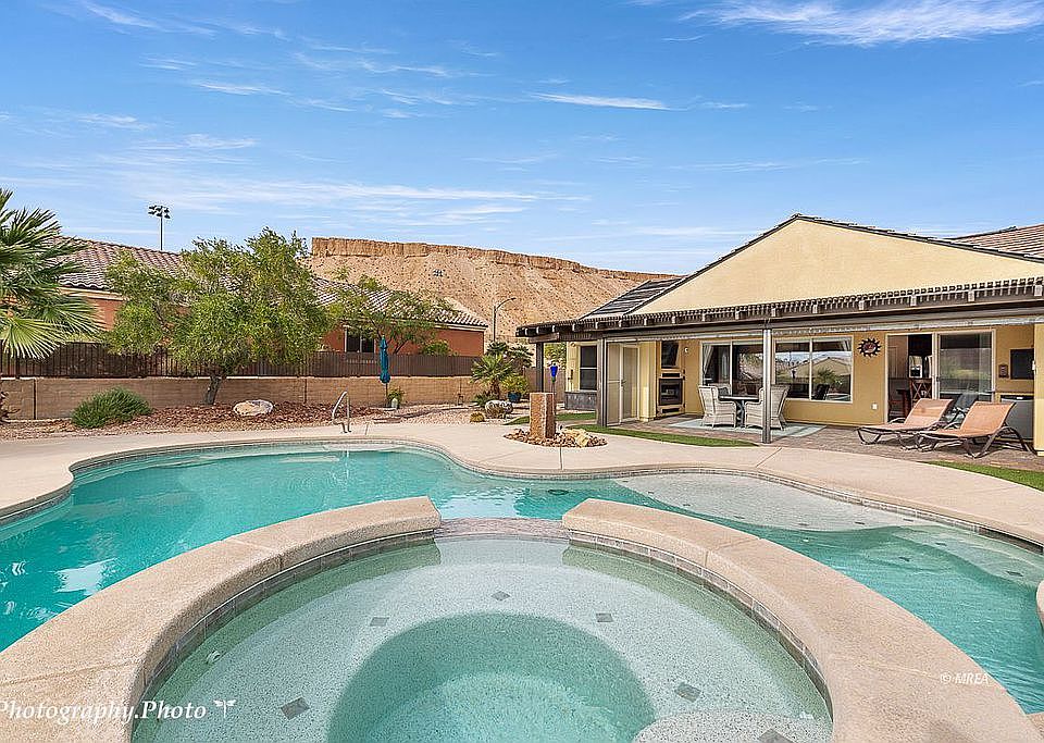 Spectacular Pool and Spa - Outdoor Experience is nothing short of "Resort Style" living. Why go on vacation when you have luxury at your finger tips in your own backyard. This outdoor living area exceeds expectations. Swimming Pool and Spa are located on an elevated lot with unobstructed views of the valley. Pool can be heated by solar or propane. Outdoor covered patio is luxurious....it includes a fireplace, Built-in BBQ, costly solar screens with remote control, A/C, Wall mounted TV. The enclosed back patio can be used with the electric screens up or down fireplace on or A/C on. Pool can be operated from your phone. Brick Paver patio offers extensive outdoor areas to relax. Exceptional privacy is yours throughout the backyard. Kitchen has granite counters and custom backsplash. Master bedroom Suite has "amazing views of the pool area". Crown molding, pull-out shelving, central vac are a few more of the upgrades. Both bathrooms have custom designed tile showers with accents. Garage is air conditioned with epoxy covered floors, utility sink and additional storage. ALL FURNISHINGS INCLUDED ( except twin bed in den ). SID PAID IN FULL. AVAILABLE NOW !!!