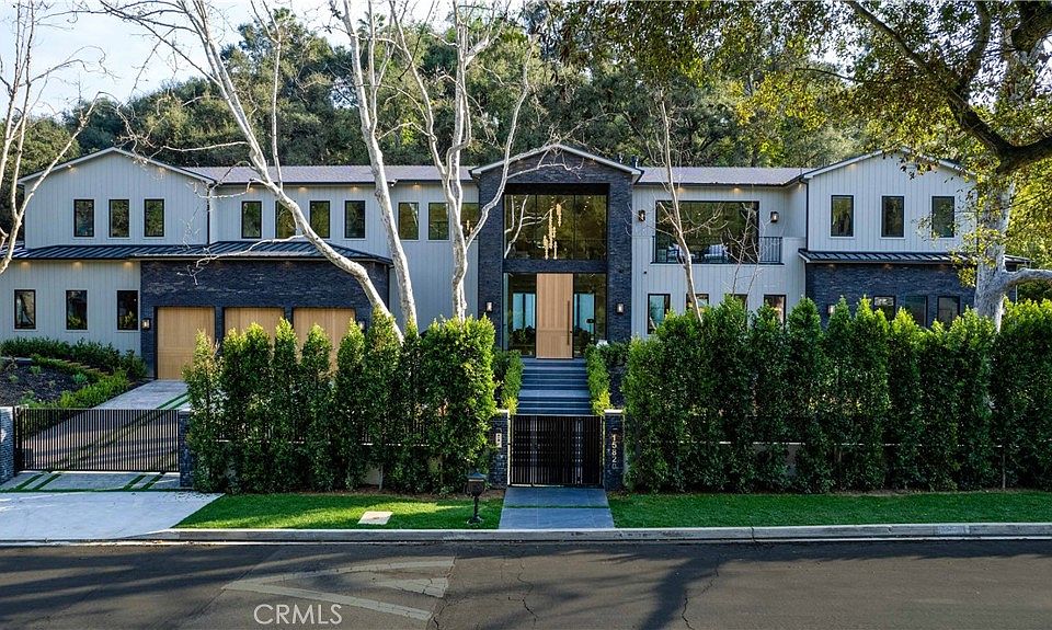 New custom estate on a prestigious street in the highly coveted Royal Oaks neighborhood of Encino - enveloped by oak trees providing privacy and a feeling of secluded nature. Featuring 6 BR – 11 BA, office, gym, and home theater in over 12,000 sq ft on an almost 40,000 sqft wide, gated lot with tall trees for privacy. Expansive gourmet kitchen features Taj Mahal quartzite countertops, two islands, breakfast nook, custom cabinetry, Wolf appliances including espresso maker, walk-in pantry, and full secondary kitchenette. Family room features custom built-ins, two-way fireplace with porcelain slab accent wall, and sliding doors to covered patio area. Bright dining room features wet bar with seating, wine refrigerator, and walk-in wine display with accent lighting. Adjacent formal living room features two-way fireplace and sliding doors to yard. Second wing features den area with wet bar and sliding doors to yard, en-suite office with custom built-in, en-suite gym with floor-to-ceiling mirrored walls, and home theater with custom built-ins. Spacious and serene yard features stunning modern pool/spa and resort-like amenities such as firepit, BBQ area with bar seating, custom water feature, basketball hoop/sport court, and oak-lined hillside highlighted by accent lighting. Staggering primary suite of over 1,300sqft features high, pitched ceiling, custom accent wall, seating area with built-ins/fireplace and balcony, and second balcony/deck overlooking yard and oak hillside. Main primary bath features marble flooring/ceilings, vanity with bulb-lined makeup mirror, and steam shower with porcelain slabs. Expansive primary closet area features two walk-in closets with islands and accent lighting, and spacious secondary bathroom. Home is completed by entertainer/designer details such as custom woodwork/tilework throughout, floor-to-ceiling windows, upstairs den area with fireplace, elevator, spacious secondary en-suite bedrooms, two powder rooms, three-car garage with wide driveway for additional parking, surround sound speakers, Control 4 smart home system, and security system with alarm/cameras. Truly a must see to take in all this stunning home has to offer!