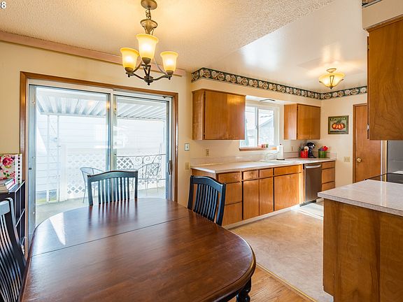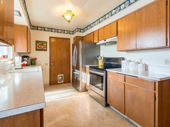 Living, dining and bedrooms have original oak floors. Roof, furnace, windows and AC were updated in the past few years. Solid wood cabinets in kitchen and built-ins in living room and hall. Slider to covered back patio. Full two car garage, newer stainless steel LG appliances, great storage throughout.