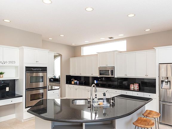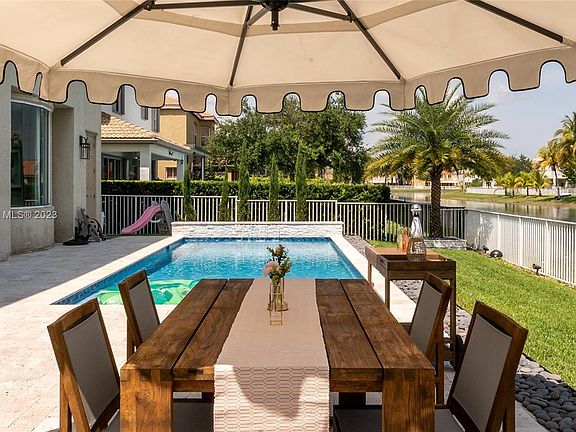 This incredible lakefront home checks all of your boxes. Beautiful custom impact glass doors greet you with water views. The first floor wraps around a grand staircase showcasing an open floor plan with an eat-in kitchen, gourmet dining area, huge pantry & a ground-floor bedroom/bathroom. Upstairs you will find a convertible loft/ bedroom, an upstairs laundry room, 2 jr. master suites with custom closets & an entire concrete second floor (rare!) The great master suite has incredible closets, a private balcony, a sizable bathroom & beautiful views of the lake shining through numerous glass windows. Your modern outdoor oasis boasts a heated salt-water pool equipped with an umbrella inside, lounge ledges & a lake powered irrigation system. Furniture & other bonus features are negotiable.