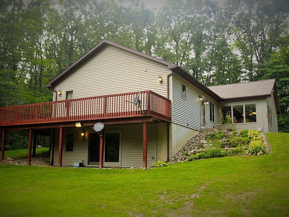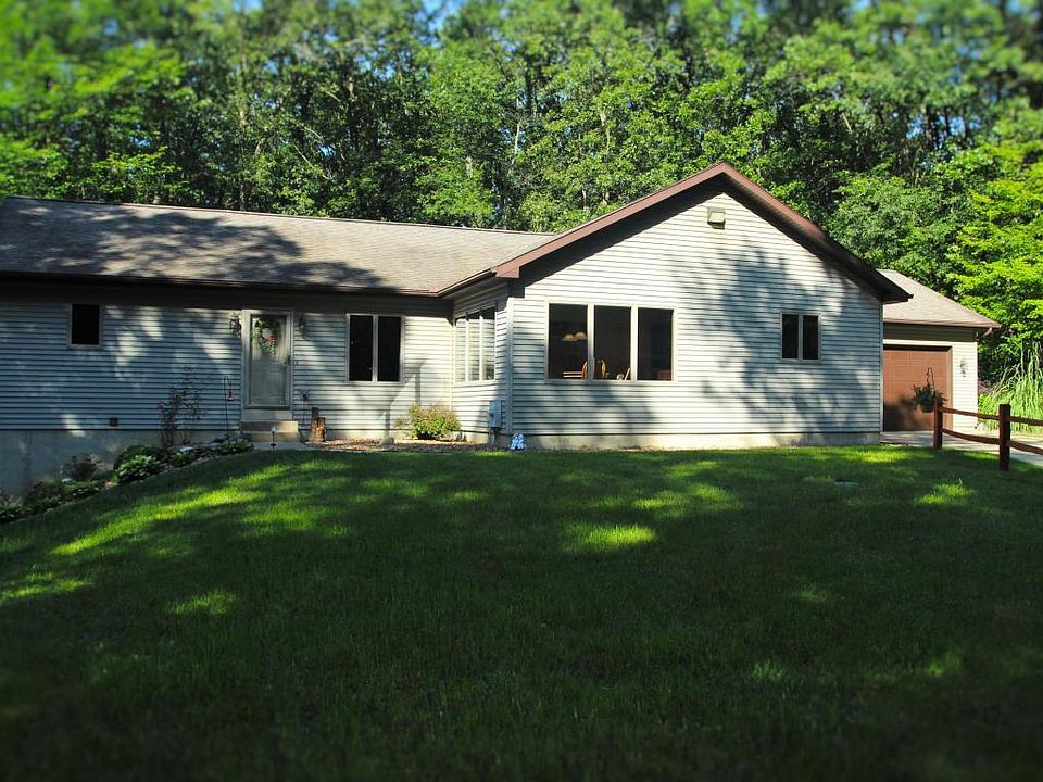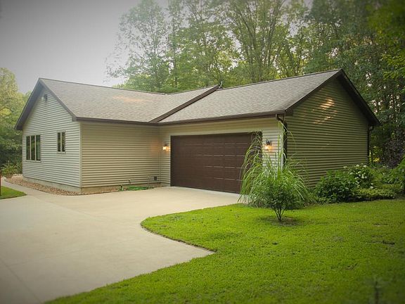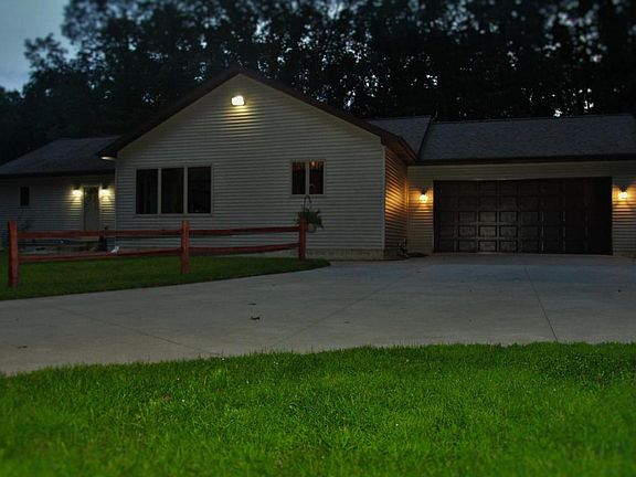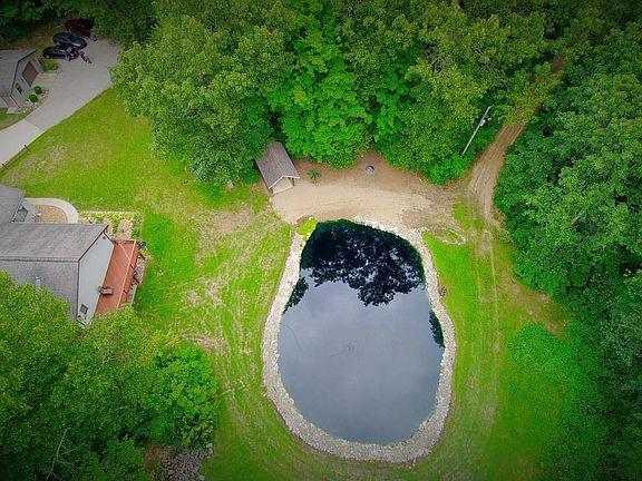 Just Listed! This 1 owner custom built 4 bedroom, 2 full bath ranch on over 5 acres! Home is nestled over 400 feet off paved road among mature oak, cherry, walnut and dog wood trees. Large lined swimming pond with sandy beach, bass and sheltered picnic area. 680 sqft. of deck, freshly stained overlooking pond and woods. Property has groomed walking trails and wildlife paradise. Home features: open floor plan; large kitchen; solid oak trim and doors; tile floors; updated floor coverings; large master bedroom with walk in closet and master bath with whirlpool tub; new 96% eff. furnace and central air; 16' Cathedral ceilings in massive living room with gas fireplace; full walkout basement with 4th bedroom, bar, movie theatre, large rec room, 200 amp service, water softener, security alarm,